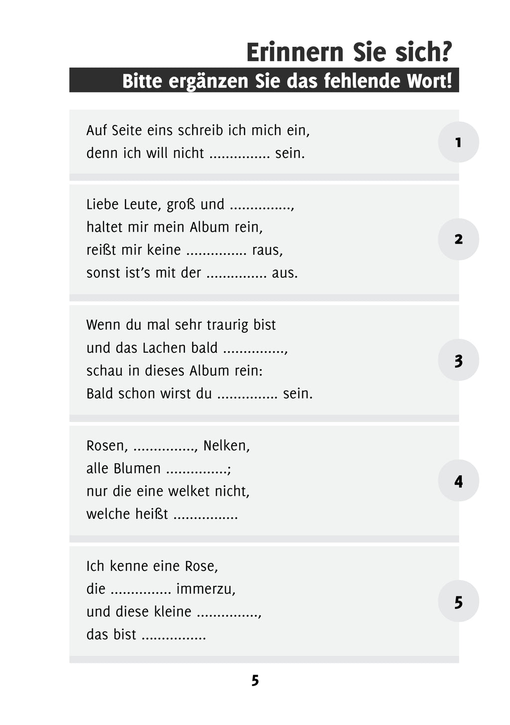 Jeder kennt den Spruch „Rosen, Tulpen, Nelken, alle Blumen welken.“ In dem jetzt vorliegenden Band 5 geht es um solche Poesiealbum-Sprüche. Die meisten Menschen hatten irgendwann selbst ein Poesiealbum oder bekamen die Frage gestellt: „Schreibst du mir bitte was in mein Poesiealbum?“ Und dann wurde nach dem richtigen Spruch, nach klugen oder lustigen Versen gesucht. Gute Wünsche, Ratschläge und Weisheiten für den weiteren Lebensweg. Die Erinnerung an die Poesiealbum-Sprüche ist ein Blick zurück in die Kinder- und Jugendzeit.