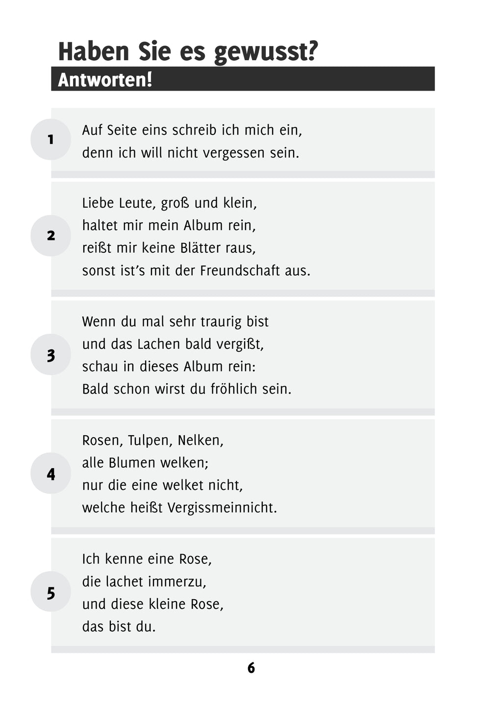 In diesem Bändchen geht es daran sich an die alten Verse und Sprüche aus den Poesiealben zu erinnern. Dazu wurden hauptsächlich Sprüche herausgesucht, die nicht von großen Dichtern stammen. Ausgewählt wurden Sprüche, die seit vielen Jahrzehnten immer wieder in den Poesiealben der jeweiligen Zeit weitergegeben und abgeändert wurden und so heute noch vielfach bekannt sind.
