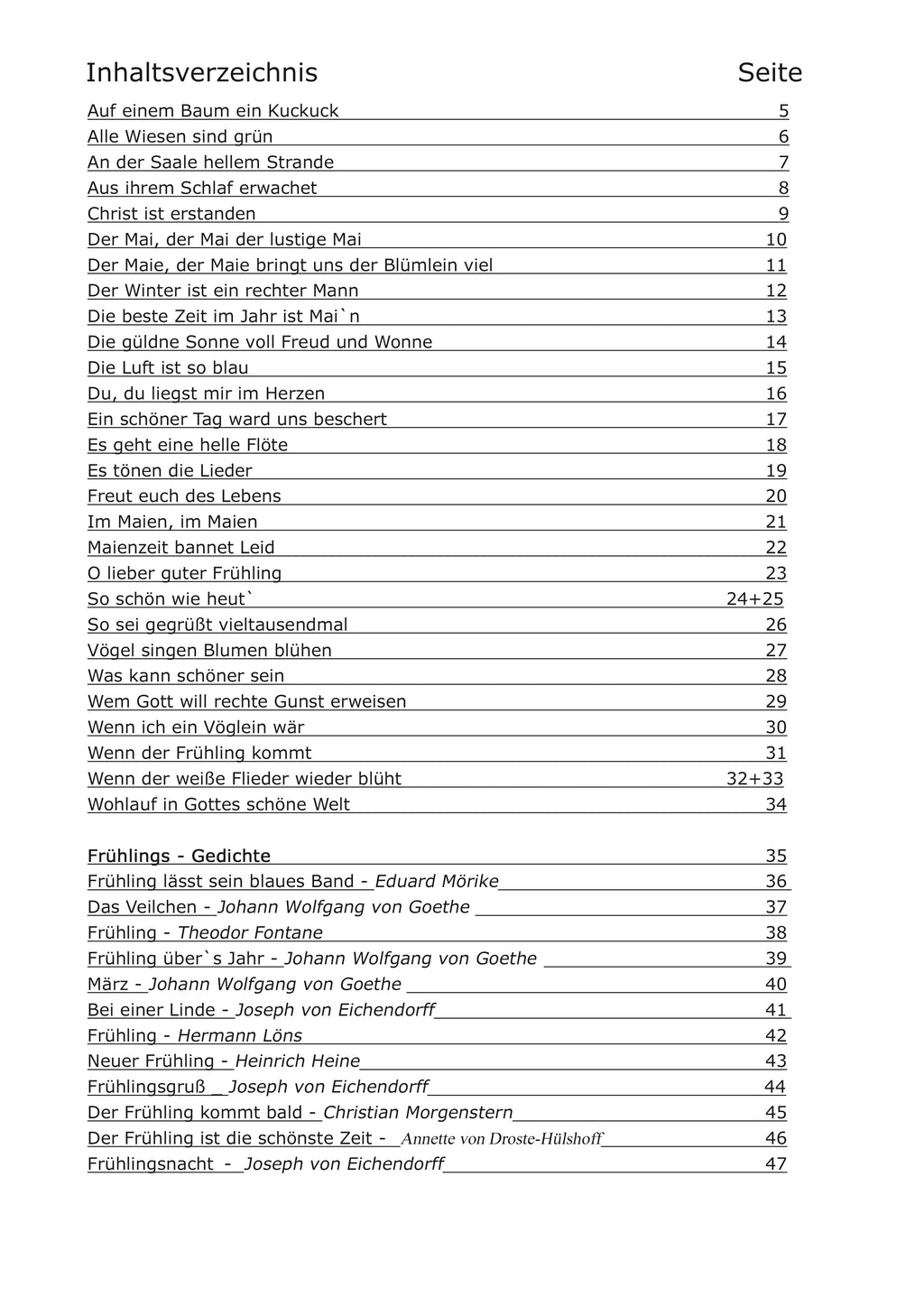 Mit Liedern wie "Es tönen die Lieder", "Auf einem Baum ein Kuckuck" oder "Freut euch des Lebens" werden bei den Senioren mit und ohne Demenzerkrankung Emotionen von früher geweckt und die Sozialkompetenz gefördert. Gemeinsames musizieren fördert die Gemeinschaft und das Wohlbefinden. Mit dem schönen Gedicht "Frühling" von Johann Wolfgang von Goethe lässt sich ein gemeinsamer Seniorennachmittag gut abrunden. Durch den extra Großdruck können auch Menschen mit Sehschwäche an der Beschäftigung teilnehmen.