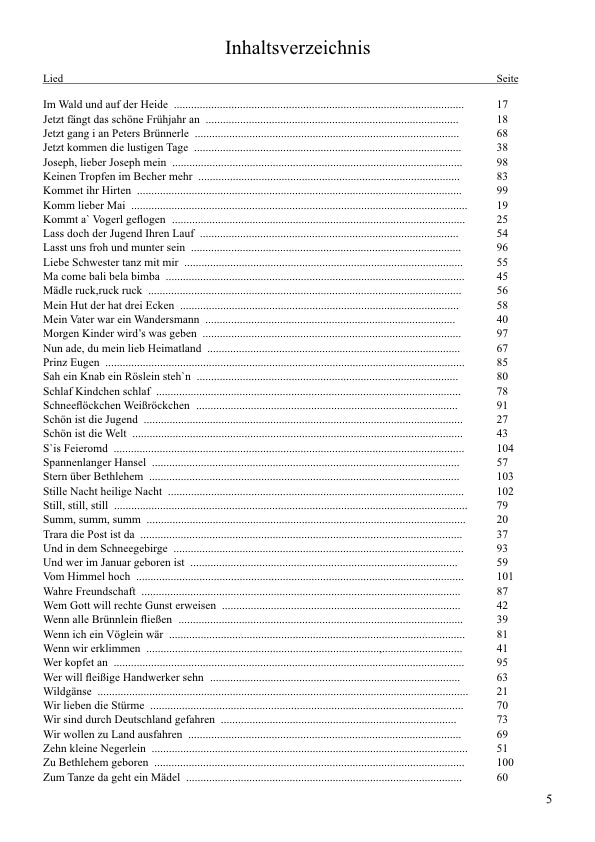 Dieses Liederbuch teilt sich in den vier Jahreszeiten auf, sodass es ganzjährig genutzt werden kann. Bekannte Lieder wie "Jetzt fängt das schöne Frühjahr an", "Schön ist die Welt", "Wer will fleißige Handwerker sehen" oder "Lasst uns froh und munter sein" lassen den gemeinsames Musiknachmittag zu einem unvergesslichen und erfreulichen Tag für die Senioren werden.
