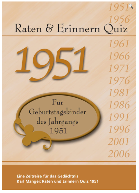 Dieser Quizband wurde speziell für Geburtstagskinder des Jahres 1951 zusammengestellt. Er führt uns zunächst zurück in dieses Jahr. Die Fragen sollen Erinnerungen wachrufen und lange Vergessenes wieder zum Vorschein bringen. Das ist Gedächtnistraining auf unterhaltsame Art und Weise.