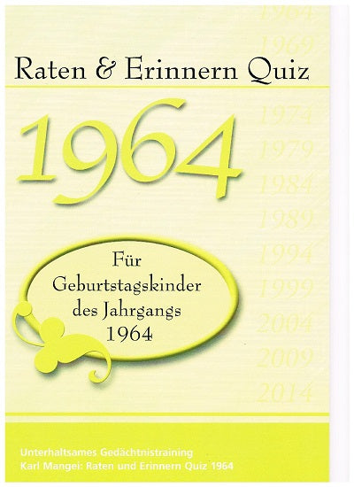 Dieser Quizband wurde speziell für Geburtstagskinder des Jahres 1964 zusammengestellt. Die Fragen im ersten Teil führen uns zurück in dieses Jahr mit dem geburtenstärksten Jahrgang in der deutschen Geschichte. Ludwig Erhard war Bundekanzler der BRD und Walter Ulbricht stand an der Spitze der DDR. In Tokio fanden olympische Spiele statt und Cassius Clay wurde erstmals Box-Weltmeister aller Klassen. In Zwickau in der DDR rollte der „Trabi“ vom Band und in den USA wurde die Computer-Programmiersprache „BASIC“ entwickelt. An der Spitze der deutschen Hitparade standen Schlager wie „I want to hold your hand“ von den Beatles oder „Rote Lippen soll man küssen“ von Cliff Richard.