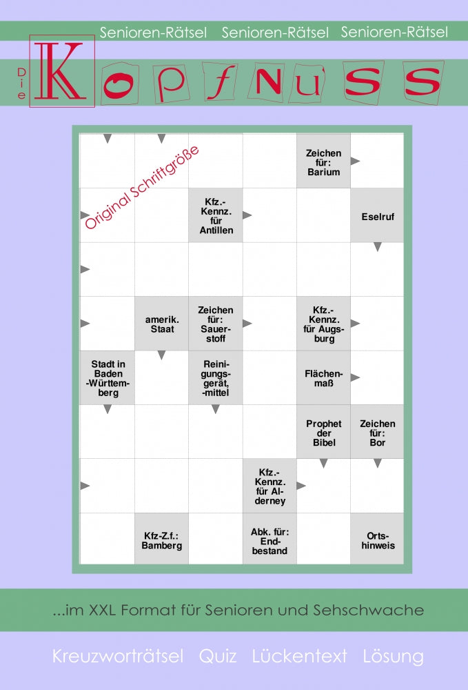 Ein Kreuzworträtsel in extra großer Schrift. Die Kästchen sind extra groß, damit es für Senioren kein Problem darstellt das Kreuzworträtsel zu lesen und zu beantworten.